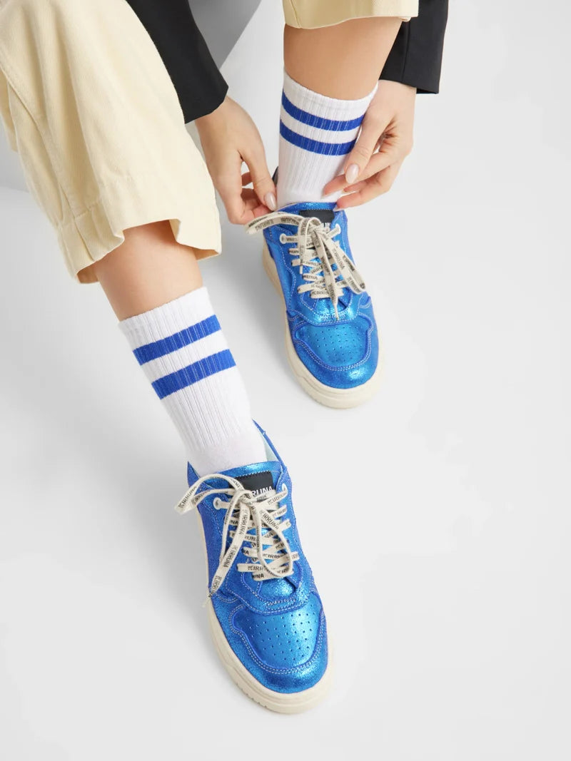 Features: Upper: Metallic blue with perforated detailing Sole: Cushioned, off-white sole for added comfort Closure: Lace-up with tonal laces and... Read more