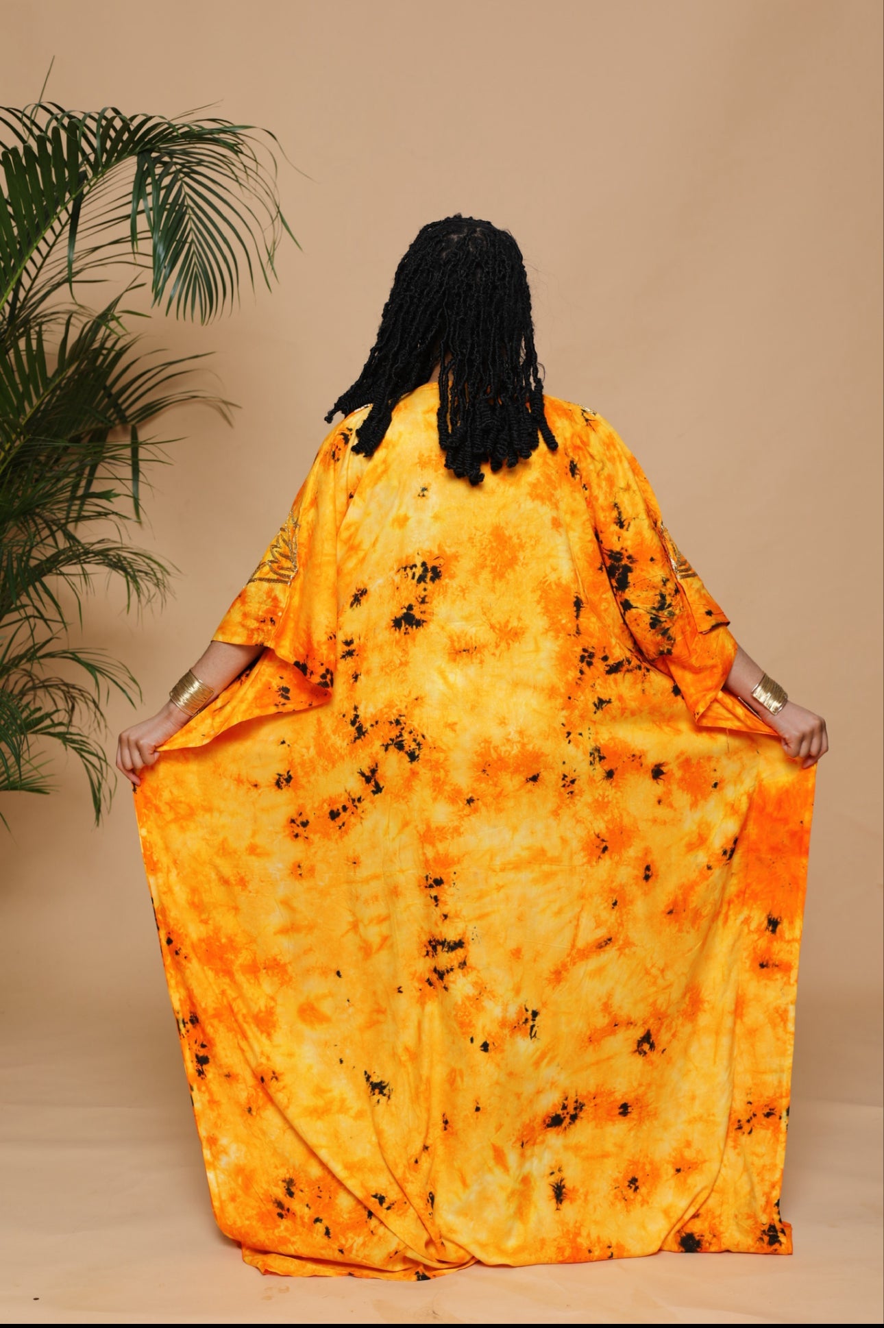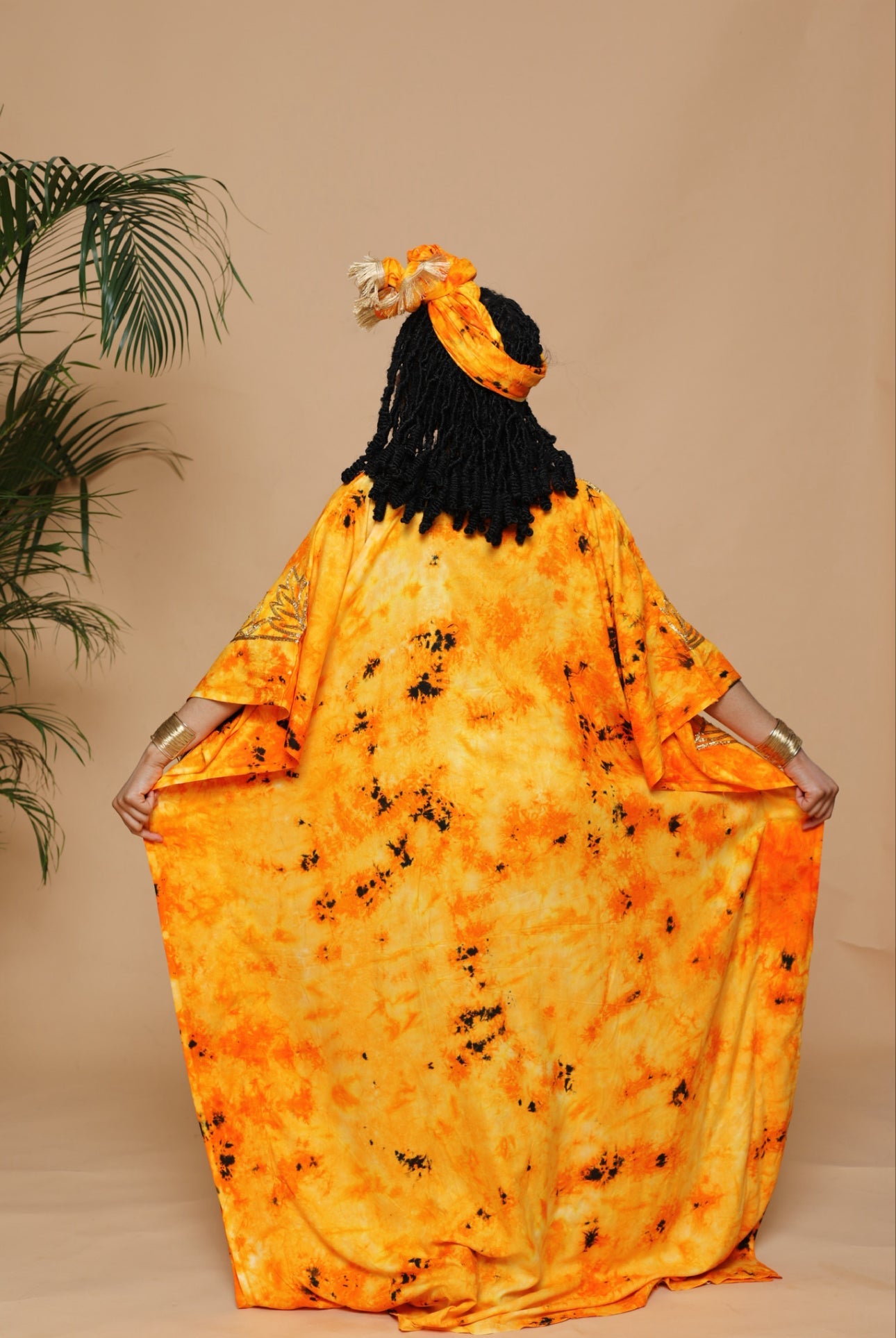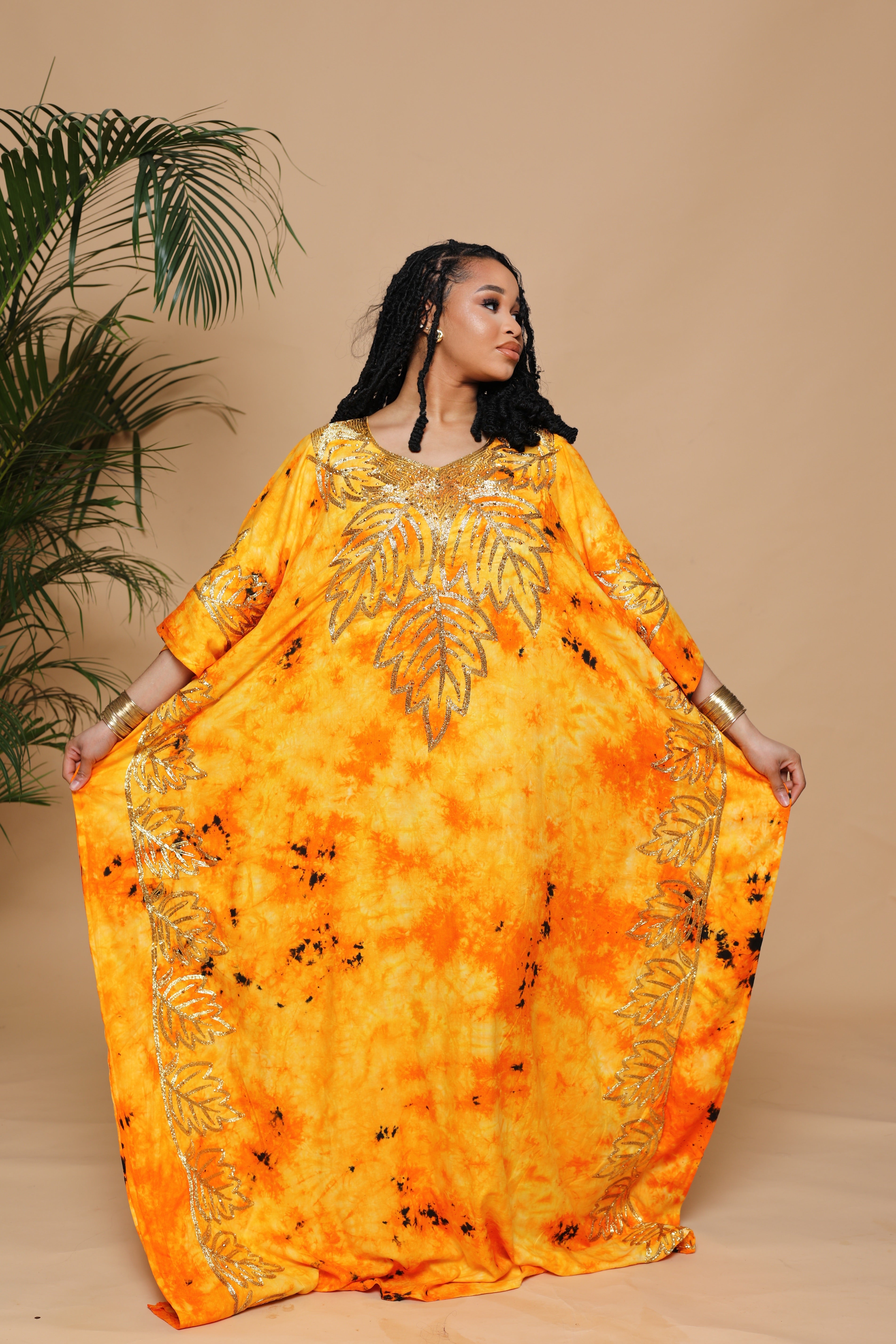 Découvrez notre robe longue avec un motif tie-dye en jaune, orange et noir, ornée de broderies en feuille d'or pour... Read more